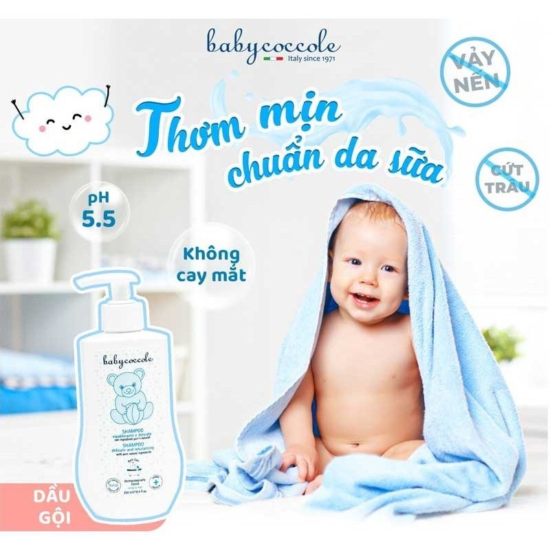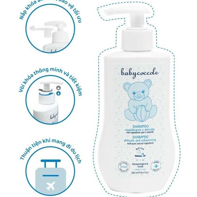 شامپو سر ۲۵۰میل بیبیکوکول دارای فرمولاسیون ملایم، سبک برای موهای ظریف نوزادان و کودکان طراحی شدهاست.
