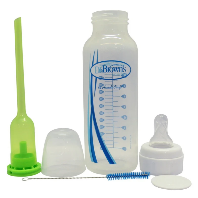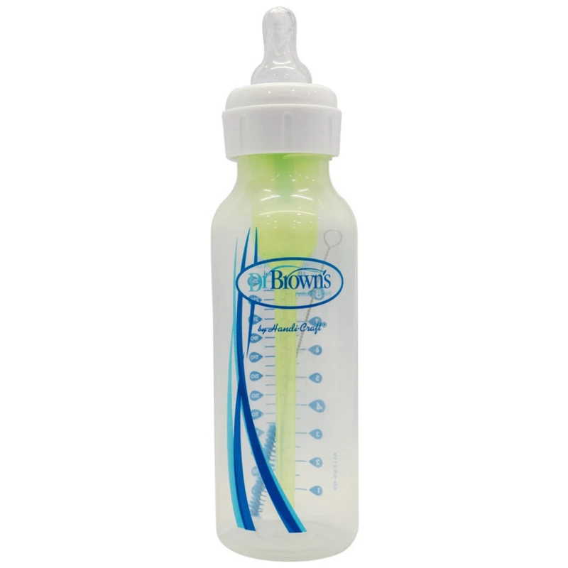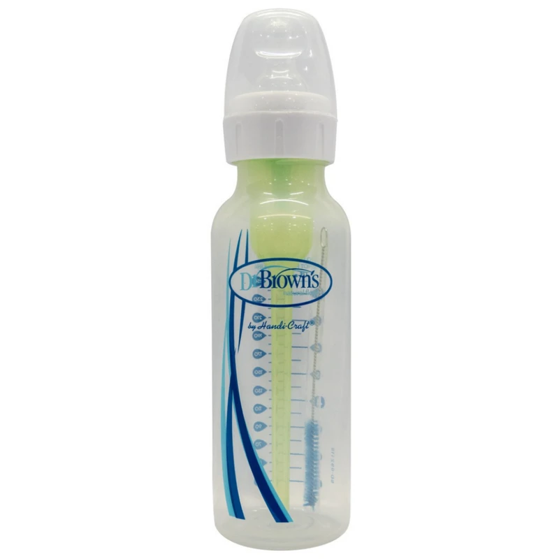 شیشه شیر دکتر براون مدل باریک آپشن پلاس با طراحی سرشیشه کوچک با قابلیت راحت مکیدن توسط نوزاد و قسمت خروجی هوا آنتی کولیک از بهترین انتخاب ها برای نوزاد و کودک شماست. جنس شیشه پلی پروپلین (طلق ) می باشد که فاقد مواد سرطانزا می باشد و شما میتوانید با خیال راحت از آن استفاده کنید این شیشه شیر دارای یک نی سبز رنگ (ونت) برای خروجی هوا طراحی کرده است که البته باید در نظر داشت این قسمت باید برای جابه جایی هوا طراحی شده است و برای شیر خوردن نیست. از طریق این نی هوای داخل شیشه و گاز شیر به کف شیشه شیر برگشت داده میشود که با توجه به این ویژگی کودک شما به راحتی روند شیر خوردن را کامل میکند و بهد از شیر خوردن به هیچ عنوان دچار دل درد یا نفخ نمی شود. ونت دکتر براون (قسمت آنتی کولیک) باعث شده تا دکتر براون در دنیا بهترین برند شیشه شیر برای کودکان نوپا و نوزادان باشد خروجی سرشیشه شیشه شیر دکتر براون شماره یک +0 ماه می باشد که جریان خروجی آن یک قطره می باشد. به هیچ عنوان نگران نباشید چون یکی از ویزگی های شیشه شیر آپشن پلاس این است که شما به راحتی بدون نی سبز رنگ هم میتوانید از این شیشه شیر ها استفاده کنید. اگر دوره ی کولیک کودکتان به اتمام رسیده باشد شما به راحتی میتوانید آن را جدا کنید شیشه شیر دکتر براون 250 میل کد 81005 یکی از محصولات محبوب این برند آمریکایی است که برای نوزادان بالای 3 ماه طراحی شده است. این شیشه شیر با ویژگیهای منحصر به فرد خود، به تغذیه راحت و ایمن نوزاد کمک میکند. ویژگیهای شیشه شیر دکتر براون 250 میل کد 81005: حجم: 250 میلی لیتر، مناسب برای نوزادان بالای 3 ماه. جنس بدنه: طلقی: سبک و مقاوم در برابر ضربه. شیشه ای: مقاوم در برابر حرارت و قابل شستشو در ماشین ظرفشویی. جنس سرشیشه: سیلیکونی نرم و با کیفیت. سیستم تهویه داخلی: کاهش نفخ و کولیک در نوزادان. جلوگیری از ورود هوا به معده نوزاد. حفظ ویتامینهای شیر طراحی : دهانه عریض (نچرال): شبیه سازی مکیدن از سینه مادر. درجه بندی دقیق: برای اندازه گیری آسان مقدار شیر. فاقد مواد مضر: BPA و سایر مواد شیمیایی مضر. توصیه پزشکان: مورد تایید پزشکان اطفال در سراسر جهان. مزایای شیشه شیر 250 میل دکتر براون: کاهش نفخ و کولیک نوزاد. تغذیه راحت و ایمن. حفظ ارزش غذایی شیر. نکاتی در مورد استفاده از شیشه شیر دکتر براون: قبل از هر بار استفاده، شیشه شیر و سرشیشه را به طور کامل بشویید و استریل کنید. جریان سرشیشه را متناسب با سن و نیاز نوزاد خود انتخاب کنید. در هنگام شیردهی، نوزاد را در وضعیت مناسب قرار دهید. پس از هر بار استفاده، شیشه شیر را به طور کامل تمیز کنید. شیشه شیرهای دکتر براون در انواع مدلها و طرحها موجود هستند. شما میتوانید با توجه به نیاز و سلیقه خود، میتوانید از طریق سایت سیسمونی آقا بزرگ مدل مناسب را انتخاب کنید. *توجه داشته باشید که برای بالا بردن طول عمر شیشه شیر و سر شیشه به هیچ عنوان آن هارا نجوشانید در عوض میتوانید از مایع استریل استفاده کنید مزایای استفاده از شیشهشیرهای دکتر براون: کاهش نفخ و کولیک نوزاد تغذیه راحت و ایمن حفظ ارزش غذایی شیر جلوگیری از رفلاکس معده شست و شوی راحتمشخصات و ویژگی ها