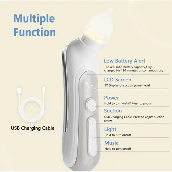 شارژی دارای کاور مناسب جهت حمل و نگهداری قابلیت تنظیم سرعت مکش در 6 حالت مختلف دارای نمایشگر نشان دهنده حجم باتری و قدرت مکش دارای 3 سر سیلیکونی جهت تخلیه مخاط بینی در 3 سطح ابتدا، میان و انتهای بینی موزیکال با قابلیت تنظیم شدت صدای موزیک و بی صدا کردن دارای مخزن با قابلیت تخلیه و شستشوی بسیار آسان چراغدار با قابلیت تغییر رنگ جهت سرگرم و آرام شدن کودک در هنگام تخلیه بینی دارای کابل شارژ شارژی و قابل حمل: با باتری داخلی و کاور مخصوص، می‌توانید پوار را به راحتی در هر کجا که نیاز دارید همراه خود داشته باشید. تنظیم سرعت مکش: این پوار دارای 6 سطح مختلف مکش است که با توجه به سن و شرایط نوزاد قابل تنظیم است. نمایشگر هوشمند: نمایشگر روی دستگاه، میزان شارژ باتری و قدرت مکش را به شما نشان می‌دهد. سرهای سیلیکونی متنوع: 3 سر سیلیکونی با اندازه‌های مختلف، برای تمیز کردن دقیق و ملایم قسمت‌های مختلف بینی نوزاد طراحی شده‌اند. موزیک آرامش‌بخش: موسیقی‌های ملایم و آرامش‌بخش، به همراه قابلیت تنظیم شدت صدا، به آرامش نوزاد حین استفاده از پوار کمک می‌کند. مخزن قابل شستشو: مخزن شفاف و قابل جدا شدن، به راحتی قابل تخلیه و شستشو است. چراغ رنگی: نورهای رنگی ملایم، علاوه بر ایجاد محیطی شاد و جذاب، به آرامش نوزاد کمک می‌کند. کابل شارژ: برای شارژ مجدد باتری پوار، یک کابل شارژ در بسته بندی محصول قرار دارد.